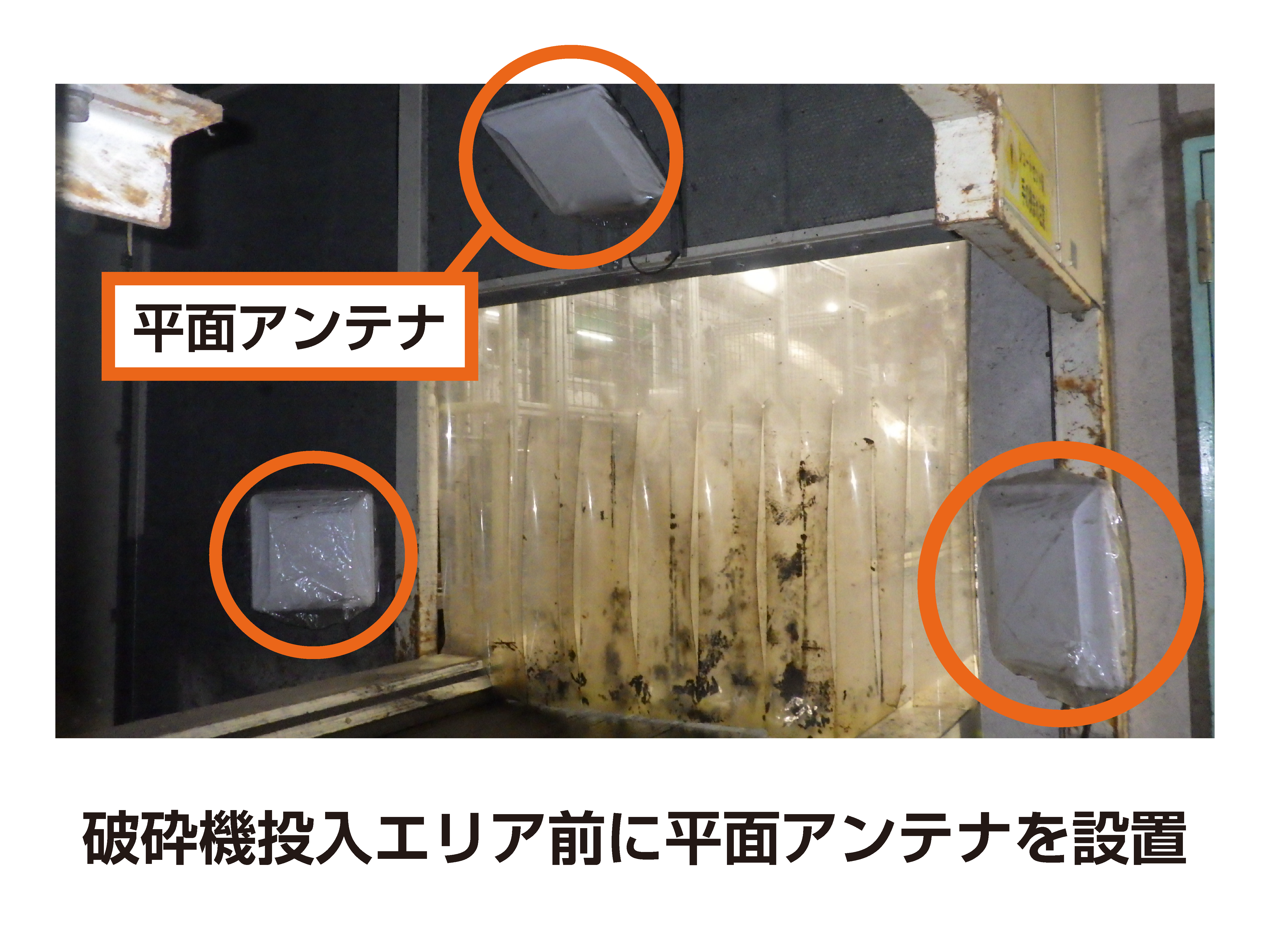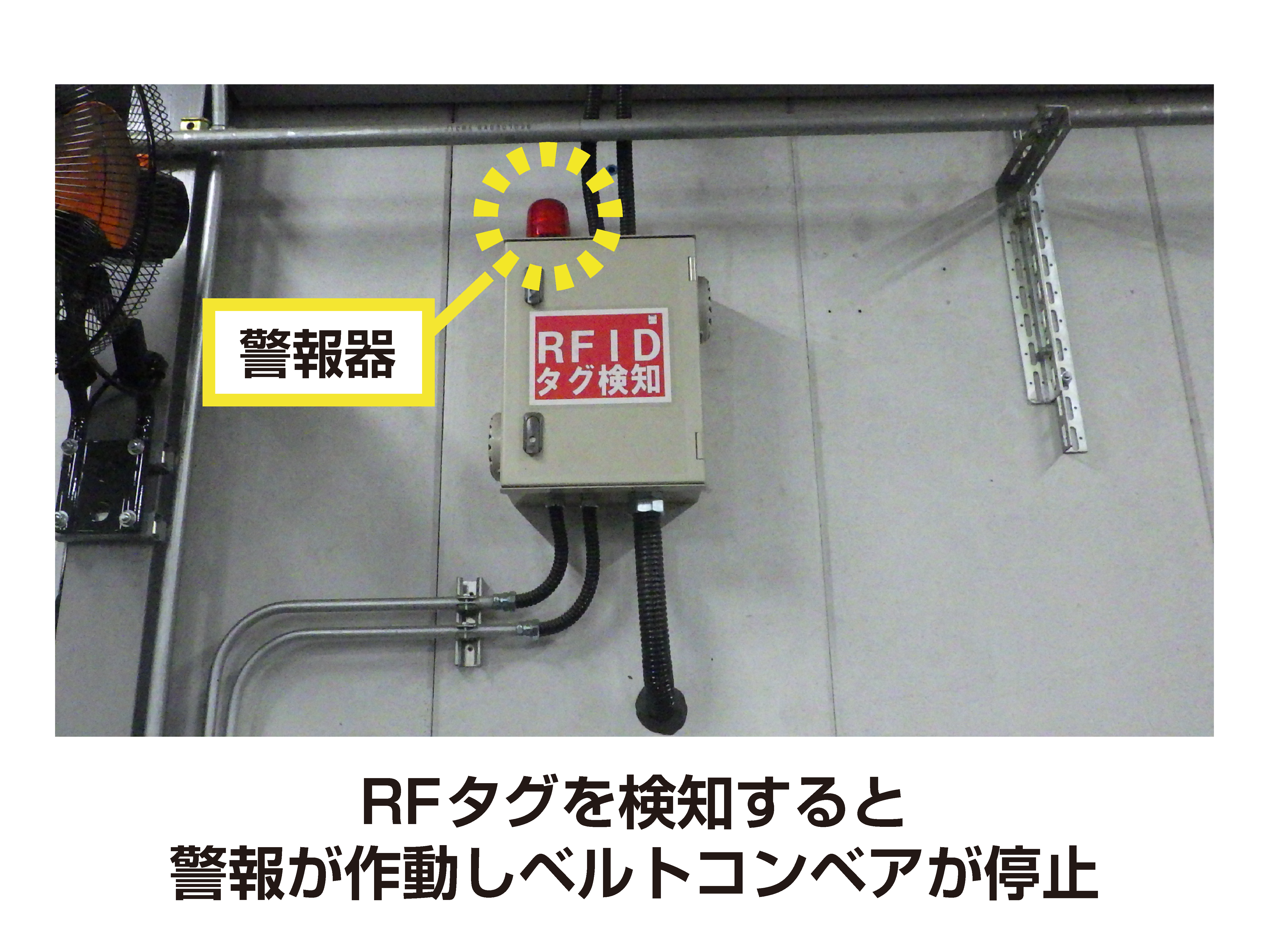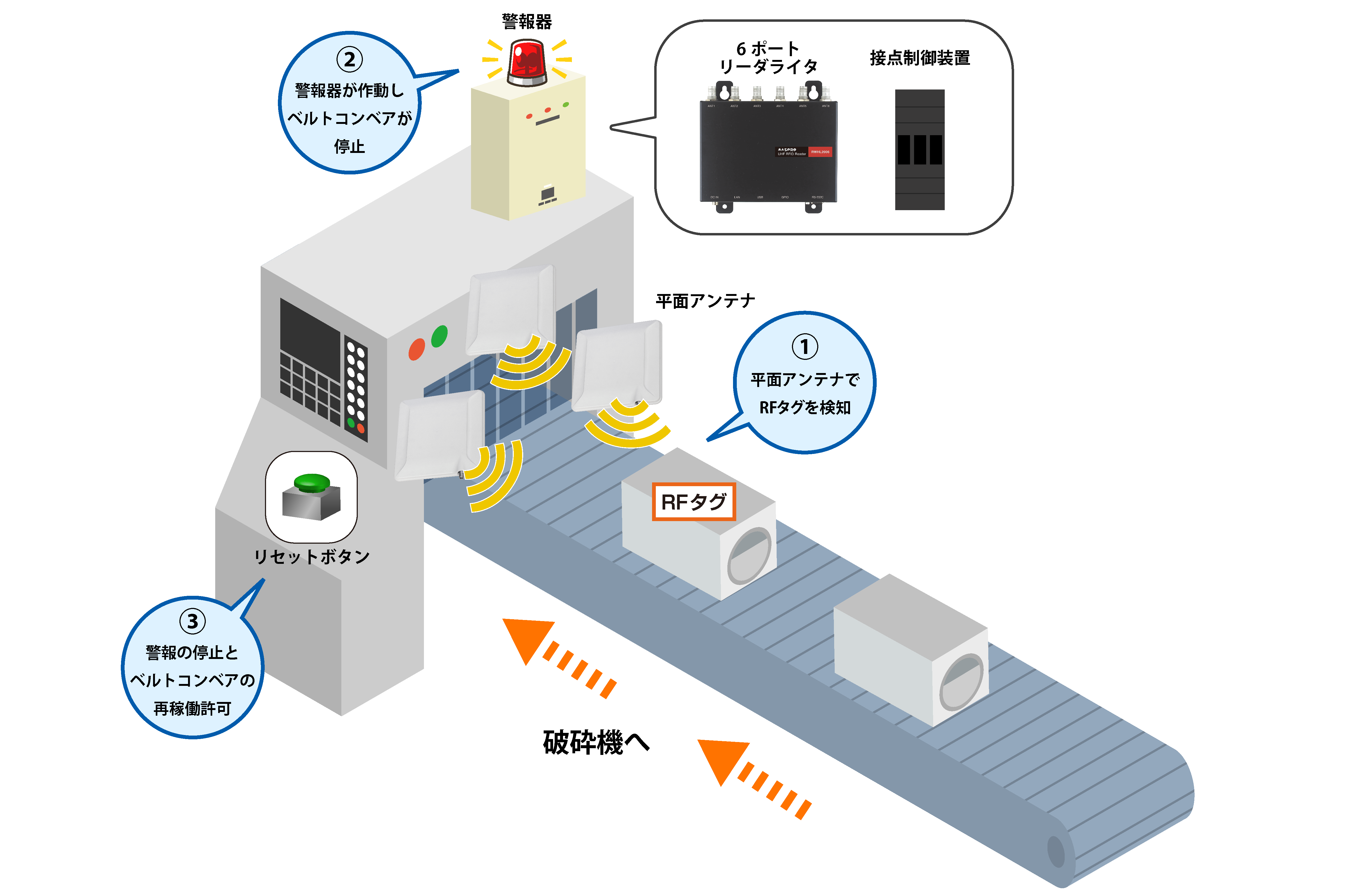 今回導入されたRFIDシステムは、破砕機投入エリア前の平面アンテナがRFタグ(リチウムイオンバッテリー)を検知すると、警報器が作動し、ベルトコンベアが停止します。また、RFタグ回収後に手元のリセットボタンを押下することで、警報は停止し、ベルトコンベアが再稼働可能となります。