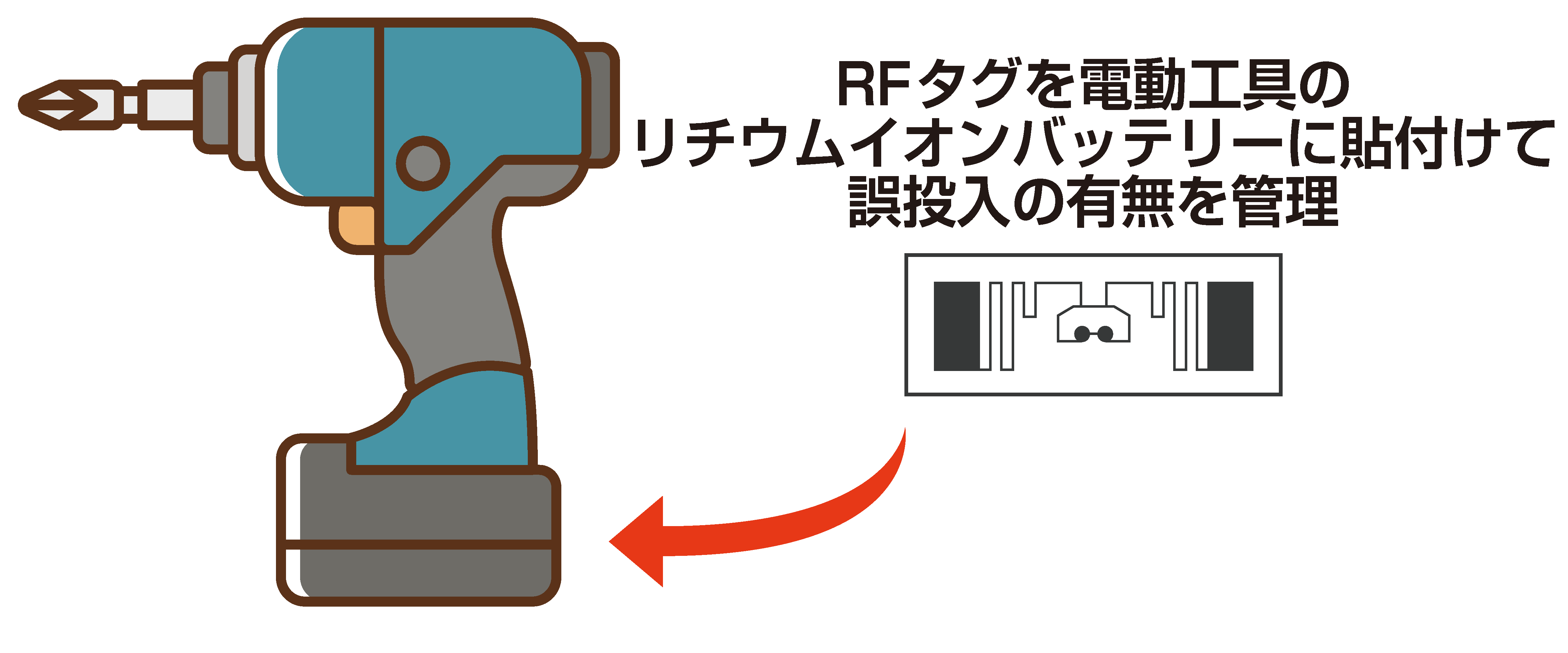 ハイパーサイクルシステムズ様は、使用済家電製品や電子機器の資源リサイクルを行なっています。今回導入いただいたRFIDシステムは、リサイクル対象製品の解体作業時に使用する電動工具のリチウムイオンバッテリーの破砕機への誤投入を防止するために使用されています。