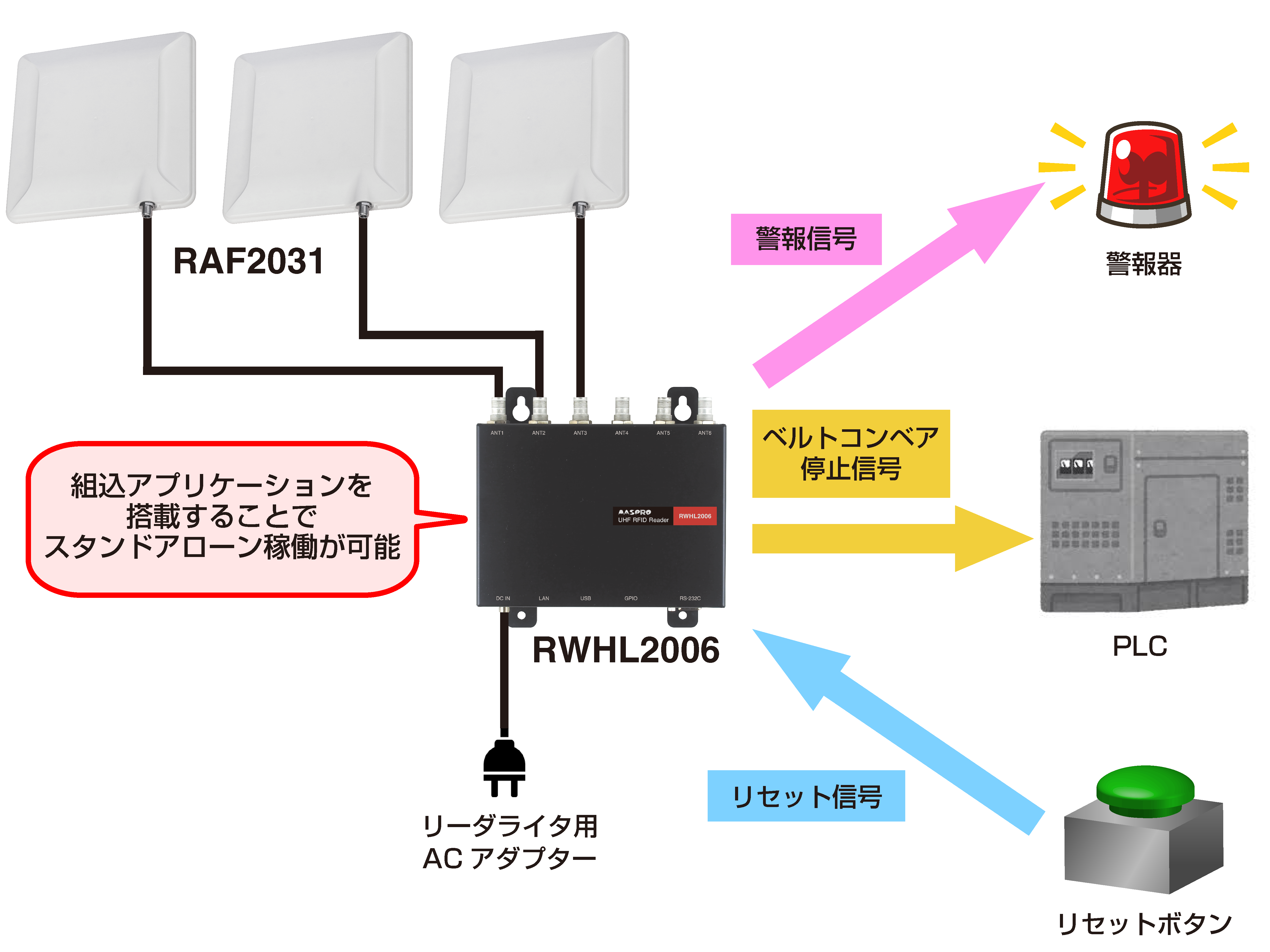 今回のシステムでは、リーダライタに組込のアプリケーションを内蔵することで、パソコン不要のスタンドアローン稼働が可能となっています。