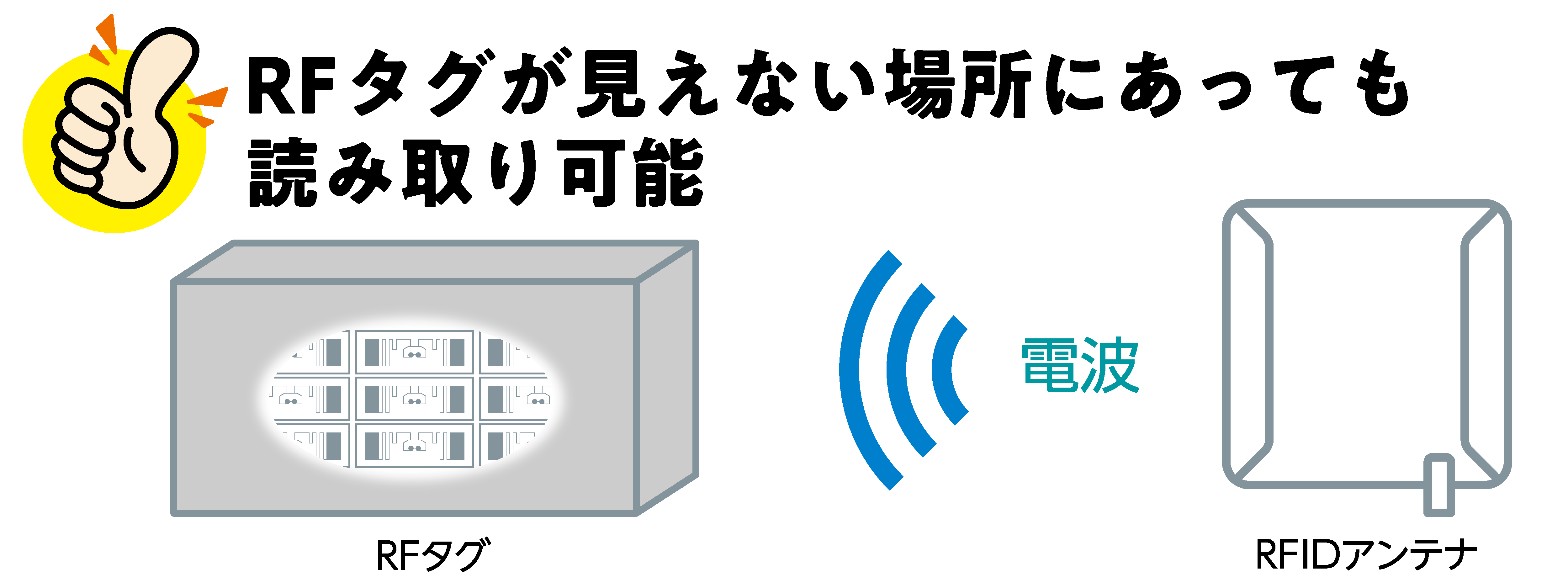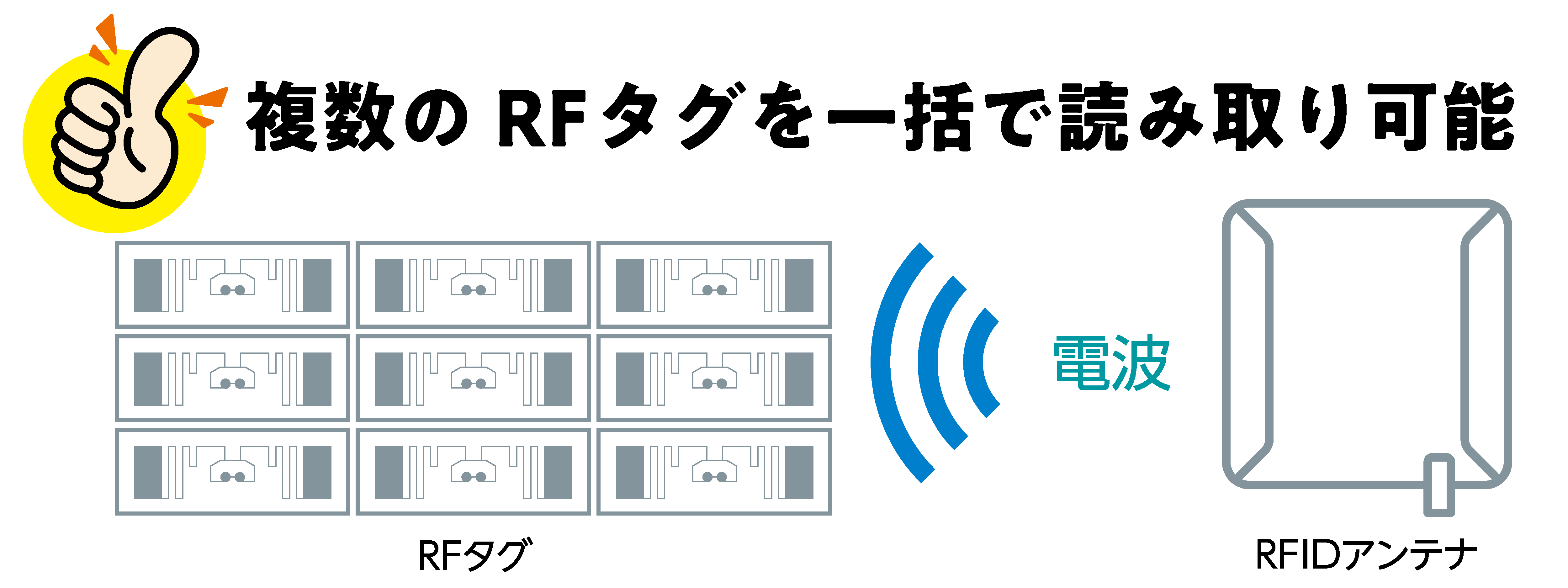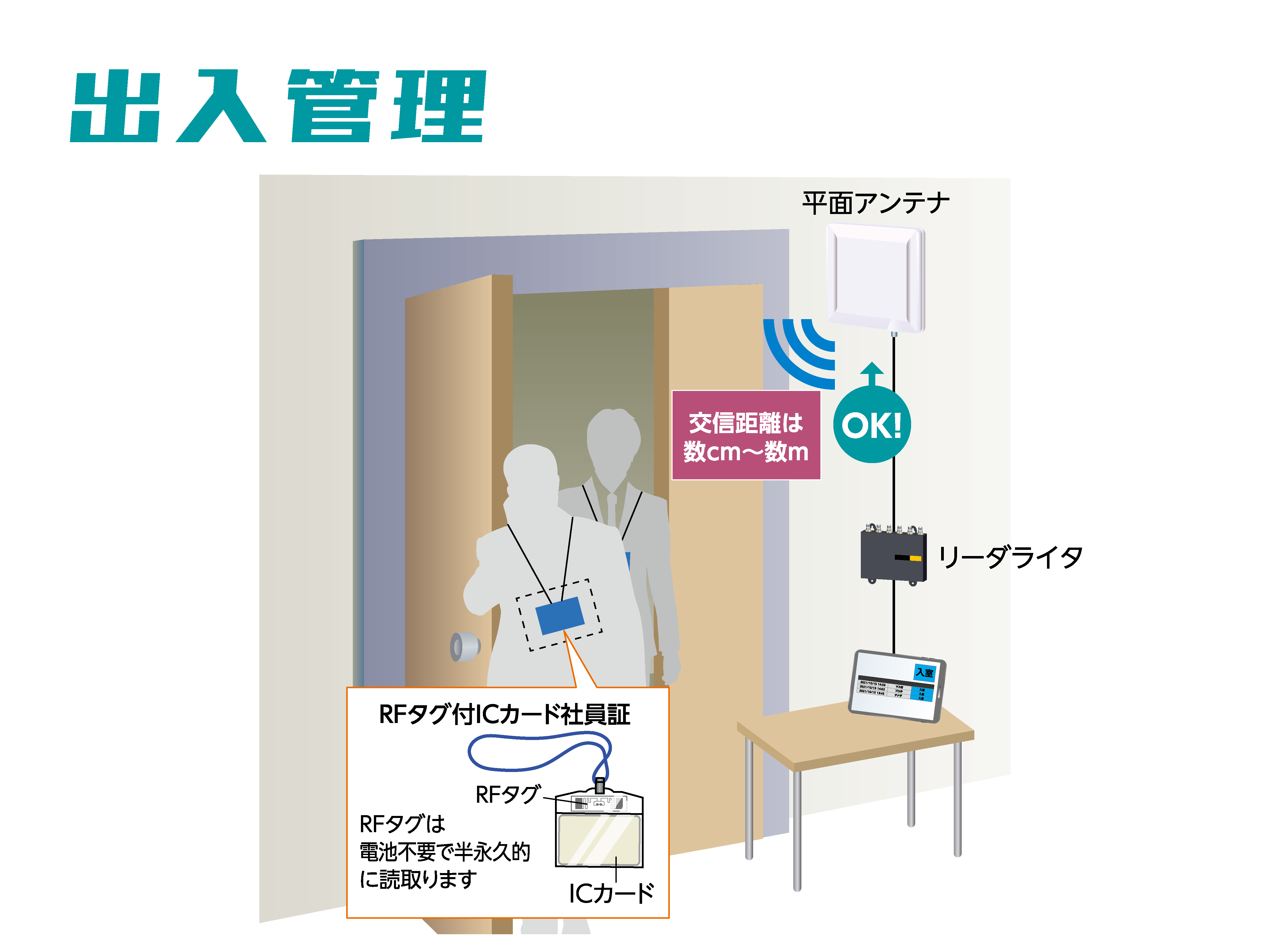 RFIDとはRadio Frequency Identificationの略で、電磁誘導または電波を利用し、無線通信によってRFタグの情報の読み出し、書き換えを行う自動認識システムのことです。