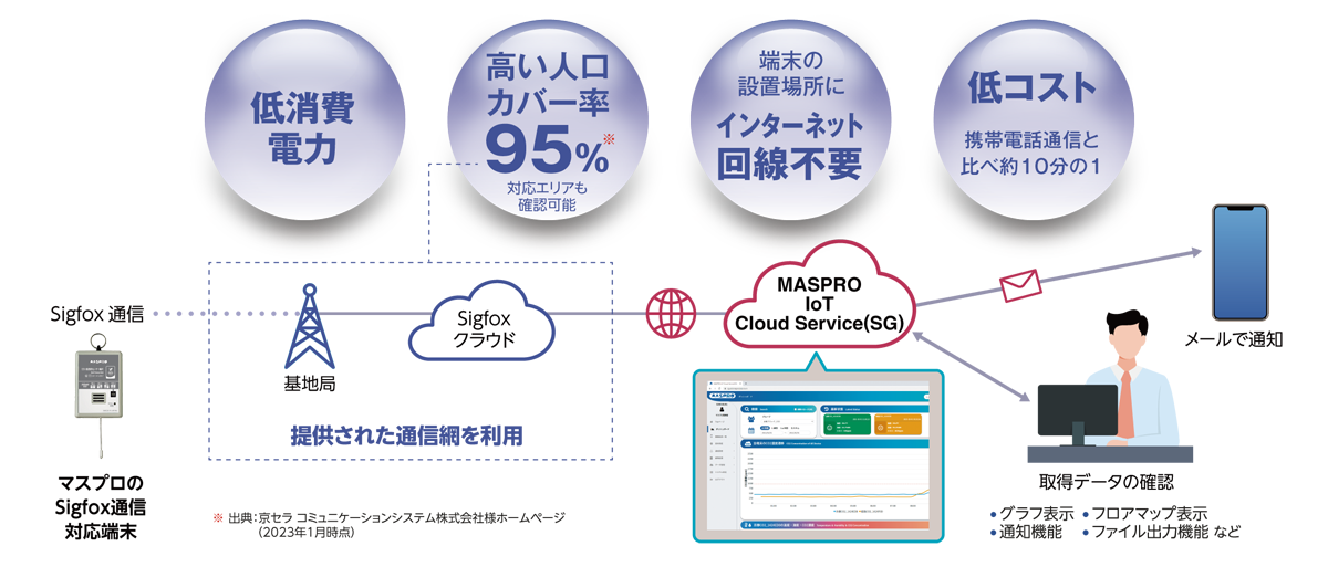 端末は、低消費電力のため、約3か月(15分に1回の送信の場合)にわたって使用できます。センサー端末で測定した情報を一覧で確認できるデータ閲覧サービスも提供しています。マスプロ電工ではLPWAの各通信方式に対応した端末を用意しており、お客様に合わせてご提案します。